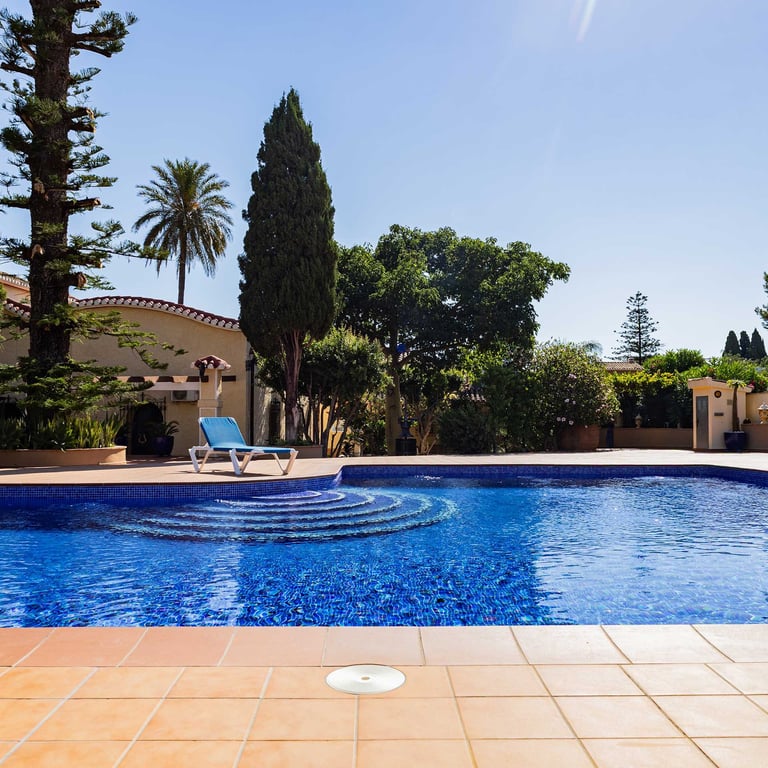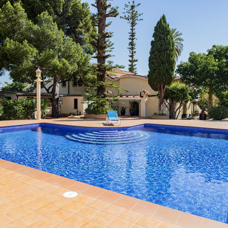 The exterior of the property is equally special, with fruit tree orchard, huge free form swimming pool, mature gardens, and stunning views of the Montgó mountain.